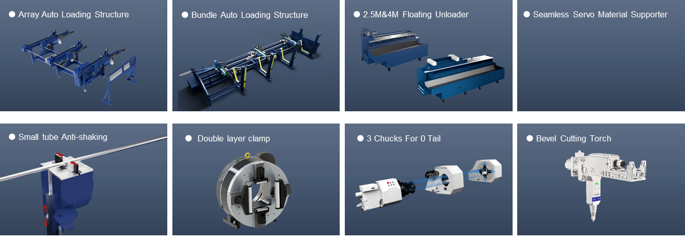 Model | Max. Material Length For Loading | Max. Material Length For Unloading | Square | Round | C-shaped | L-shaped | H-beam | I-beam | Three Chucks | Bevel-cut |